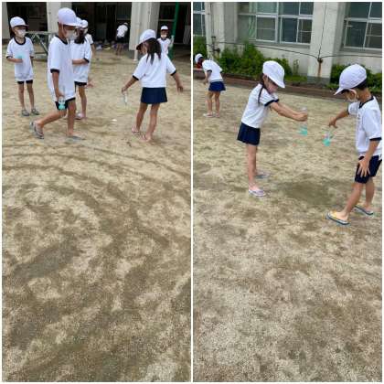 生活科では、身近な自然を利用したり、身近にあるものを使ったりして遊ぶ活動を通して、みんなと楽しみながら遊びを創り出そうとする力を養います。