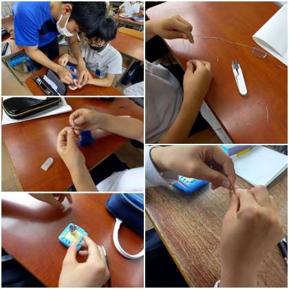 針と糸を使って、何度も『玉結び』の練習をしています。
