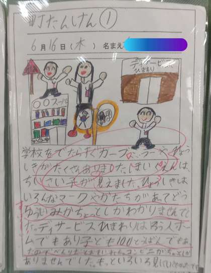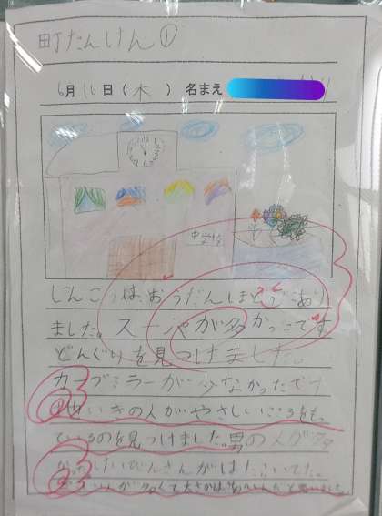 町たんけんで、見つけたことや気づいたことを絵と文でまとめています。