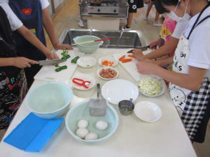 グループ内で調理の役割分担をし、楽しそうに材料を洗ったり、切ったり、いためたりしていました。
