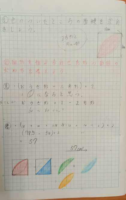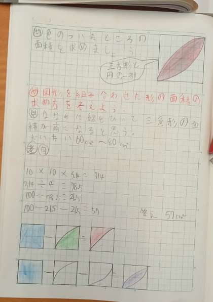 どんな形がかくれているのかを見つけて、面積を求めていきます。