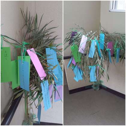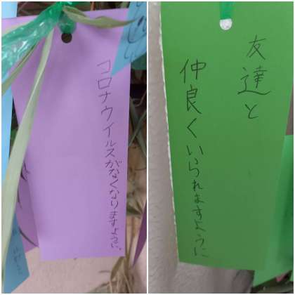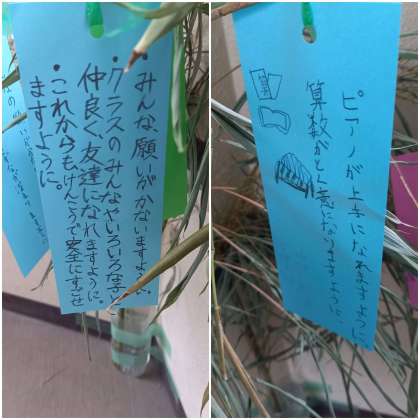 笹の葉に、子ども達の願い事が飾られています。