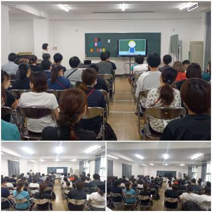 教育委員会より谷口美幸先生に来ていただき、小学校低学年からの英語教育(短時間学習)の教員研修をしました。