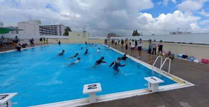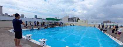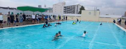 衣服を着た状態で海や川に落ちた時を想定し、その場合に命を守るにはどうすればよいのかを考え着衣水泳に取り組みました。