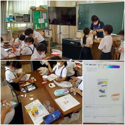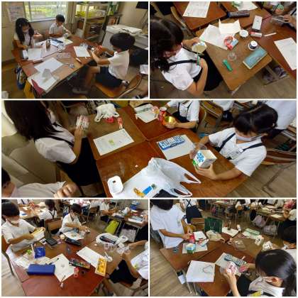 デザイン画をもとに、牛乳パック等の容器を思い思いにカットしています。