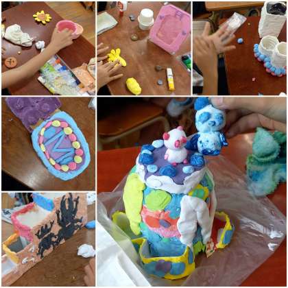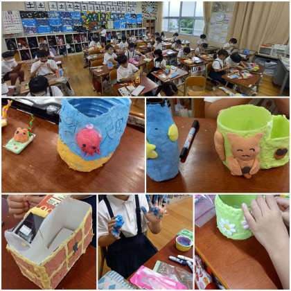 空き容器をカラフル粘土で飾り付け、素敵な入れ物に変身させています。