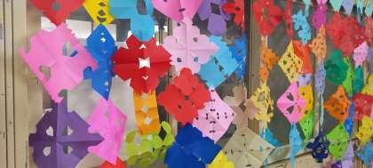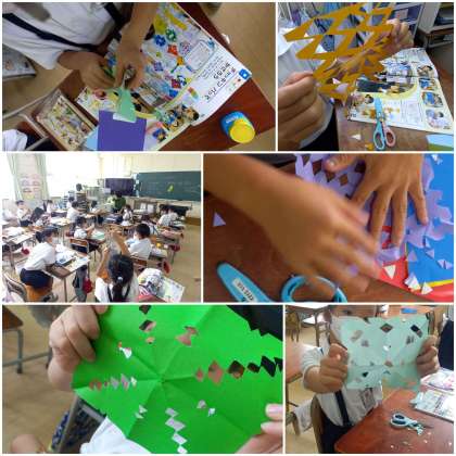 折り紙とはさみを使って、ステキな飾りを作っています。