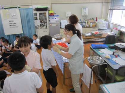 その後、歯科の校医先生にきれいに磨いた歯に一人ずつフッ化物塗布をしてもらいました。