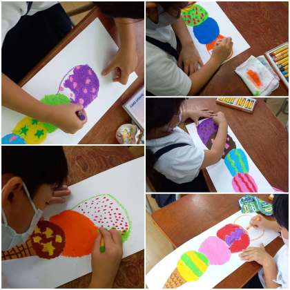 縦長の画用紙に、カラフルなアイスクリームを描いています。