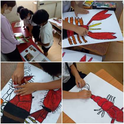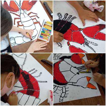 画用紙いっぱいに、生き生きとしたザリガニを描いています。
