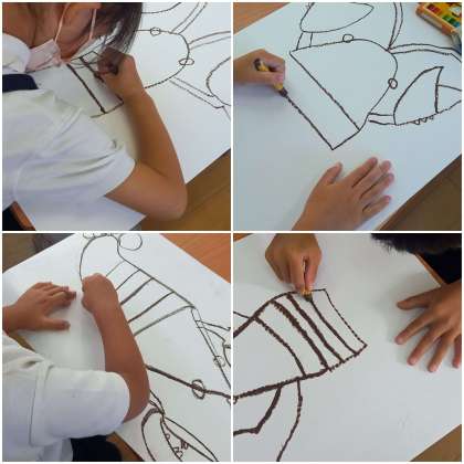 パスで画用紙いっぱいに大きなザリガニを描いています。
