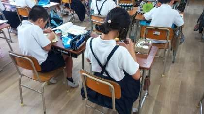 5年生では現在、家庭科の4つの学習内容「家庭生活」「食事と調理」「衣服と住まい」「消費生活と環境」のうち、「衣」にかかわる実践実習として、裁縫の学習を進めています。