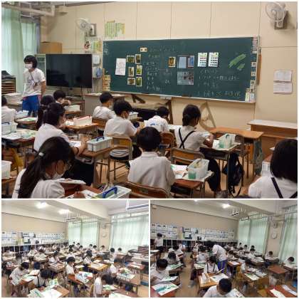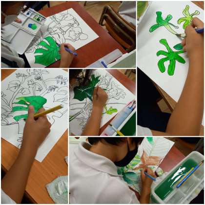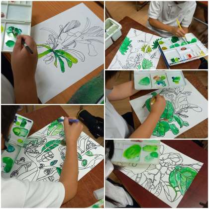 観葉植物をマジックペンで描き、それに絵の具で色付けしています。
