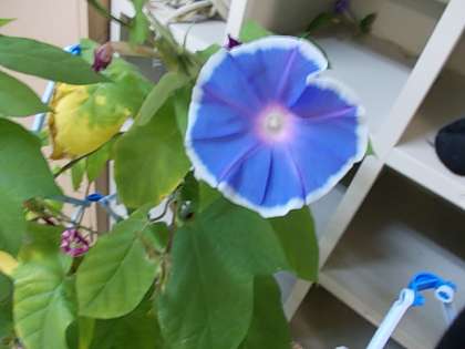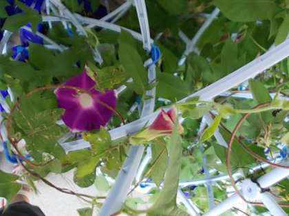1年生が春に種まきしたアサガオがきれいに大きな花をつけて咲いています。