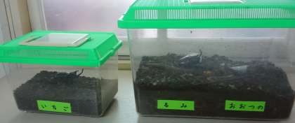 もちろん、餌やりや掃除などをしてくれている子どもたちもいますが、取り出してさわったり、「散歩」と言って廊下を歩かせたり、段ボール箱にとまらせて「闘い」をさせたり…