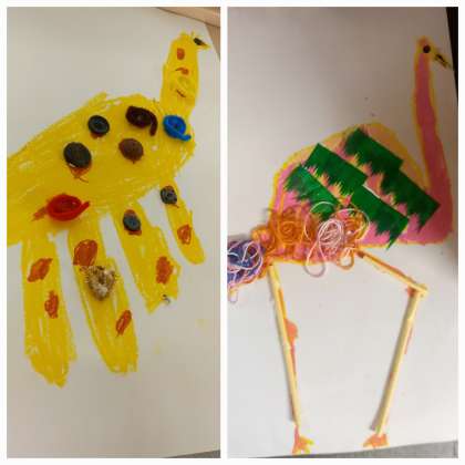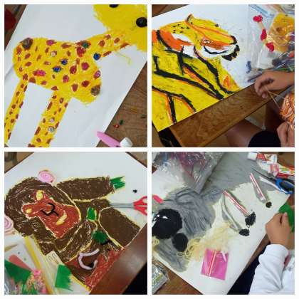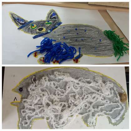 その絵に、毛糸やモール等をつけることで、より生き生きとした動物に仕上げていきます。