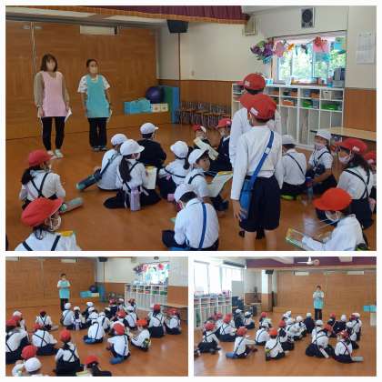 友渕児童センターでは、保育士さんに『給食は何人でつくっていますか?』『クラスはいくつありますか?』などの質問をし、一つ一つ丁寧に答えていただきました。