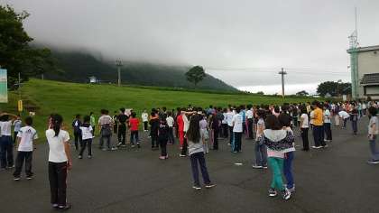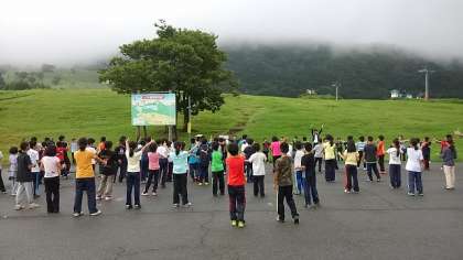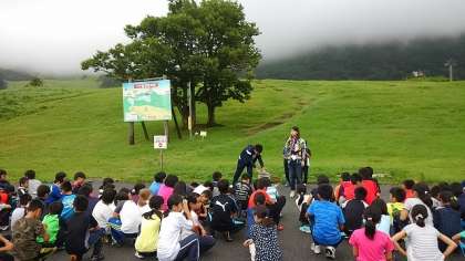 朝の気温が22度、山には霧がかかって、高原でも霧の微小な水滴を肌に感じられ、子どもたちにとって朝からいい自然体験となりました。