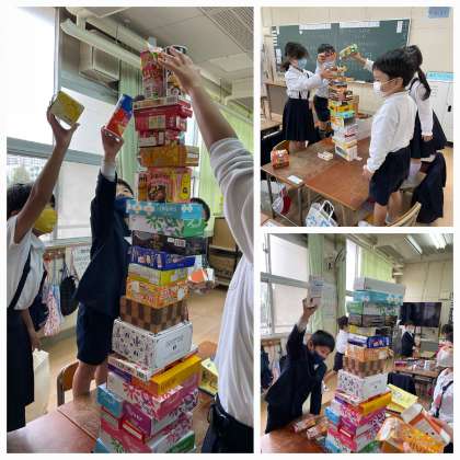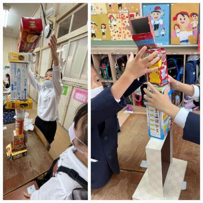 高く積み重ねるなかで、箱は重ねやすい。筒は平らな面を使うと重ねられる。箱は転がらないけれど、筒は転がる。といった、それぞれの形のもつ特ちょうに気づくことができました。