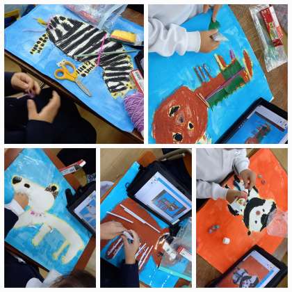 その動物に、お家の人に協力していただき用意した物(ストローや毛糸など)でデザインしています。