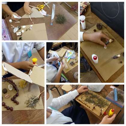 秋の素材を使って、「森の秘密基地」を作っています。 どんな秘密基地が出来上がるのか、楽しみですね。