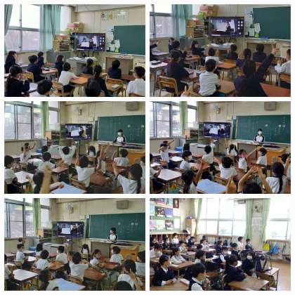 低学年は、画面の向こうから高学年が出題するクイズに大盛り上がりしていました。