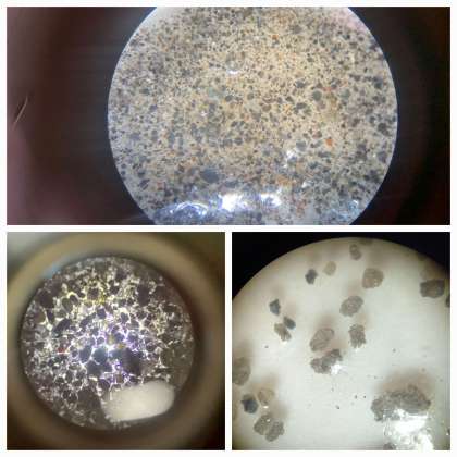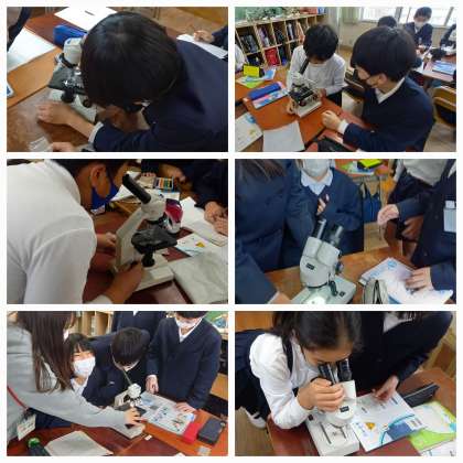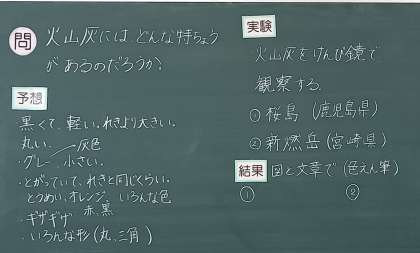 顕微鏡で、桜島(鹿児島)と新燃岳(宮崎県)の火山灰を見ています。