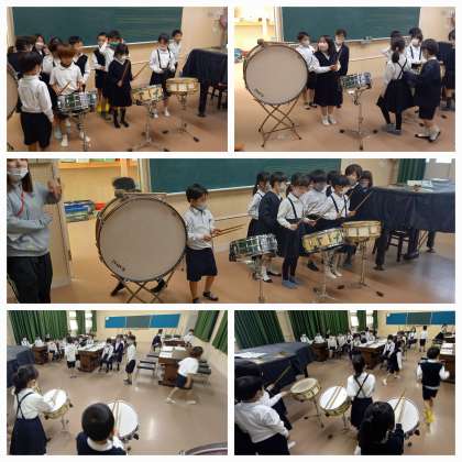 音楽室で、1年生が大太鼓・小太鼓を順番に打っています。