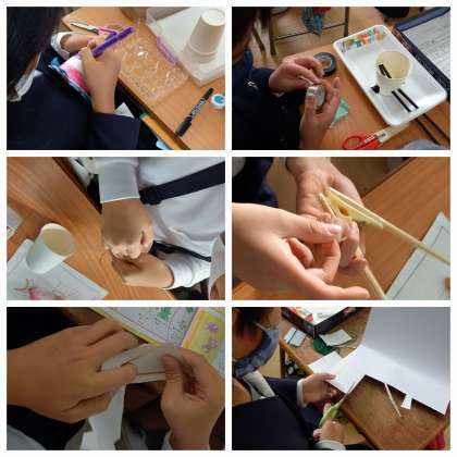 生活科の学習で、身近な物(紙コップ・ペットボトル・輪ゴム・わりばし等々)を使って、おもちゃをつくっています。