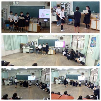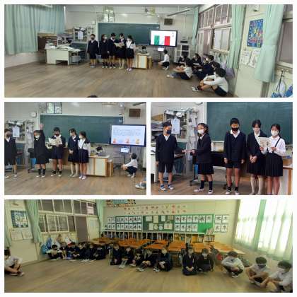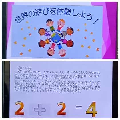 5年生は、「世界のあそび」の説明の前に、それぞれの国の有名なもの(建造物や食べ物など)を3つ紹介していました。