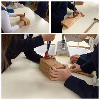 テコの原理を使うと、楽に釘を抜くことができることを実感するために、自分達で木に釘を打ち込み、それをバールを使って抜いています。