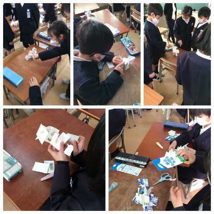 子どもたちは、板状の紙パックの板をどのようにして組み合わせるとよいのか考えています。