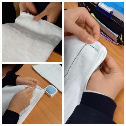 在校生に贈る『ぞうきん』を手縫いで制作しています。