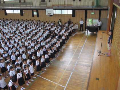始業式では、校長先生・生活指導担当の先生から夏休みの振り返りや2学期に向けて学習や生活面で頑張っていってほしいことなどのお話がありました。子どもたちは、まだまだ蒸暑い中、話をしっかりと聞いていました。最後に全員で校歌を歌って2学期を元気よくスタートしました。