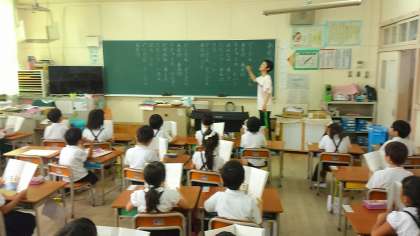 2年生のあるクラスでは、「とっきっき」という言葉遊びの詩を、先生がタンバリンを使ってリズムをとってのびのびと音声表現していました。