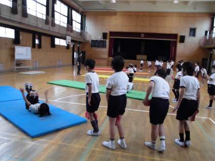 回る時に足が開かないように、赤白帽子をひざにはさんで前転の練習をしています。