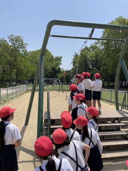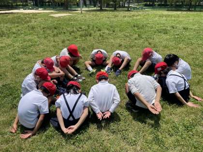 もくもく元気広場の遊具では、みんなマナーよく並んで、楽しそうに遊んでいました。芝生広場では、だるまさんが転んだやハンカチ落としなどをしていました。暑い中でしたが、いっぱい遊び元気に過ごせました。