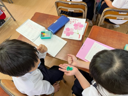 子どもたちは、おはじきを使って、友だちとゲームをしながら楽しく考えていました。