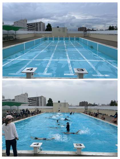 学校では、週に1回プールの水を入れ替えています。入れ替えてきれいになった水は、少し冷たいですね。