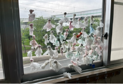 2年生の教室に入ると、窓にてるてるぼうずをたくさん飾っていました。