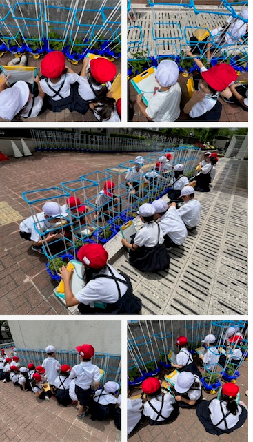 「先生見てー。こんなに伸びてる!」と、うれしそうに自分のあさがおを指さしながら、担任の先生に伝えていました。