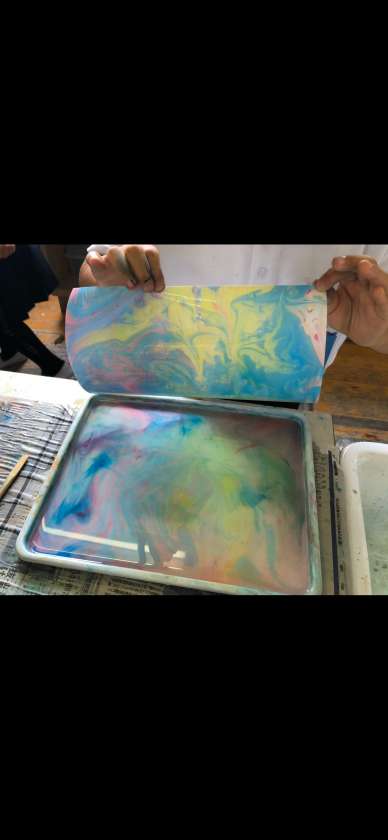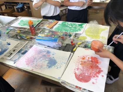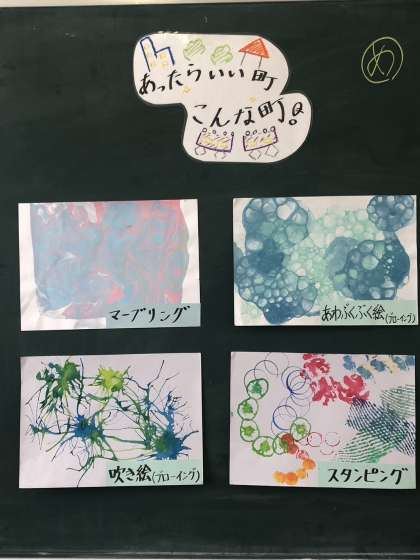 5年生は、図画工作科の学習「あったらいい町、こんな町!」でモダンテクニックを学びました。「マーブリング」「ブローイング(あわぶくぶく・吹き流し)」「スタンピング」という技法です。はじめはおそるおそるでしたが、試行錯誤を繰り返しながら、とても楽しそうに次々とチャレンジする姿が見られました。中にはいくつかの色を混ぜたり、技法を重ねたりと工夫を凝らす子どもたちも…!子どもたちの発想力に驚かされました。