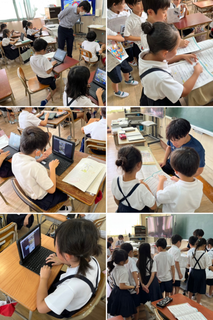 (左)2年7組は、今までタブレットで撮影したミニトマトの写真を使ってマーキングやキャプションを入れて4コマブックを作っていました。