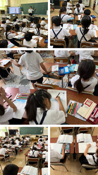 (上)1年3組では、できごとを文章で書く学習をしました。