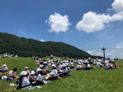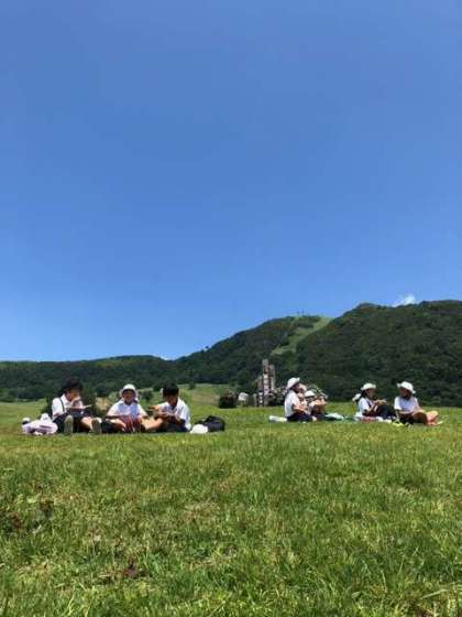 高原で活動班毎にお弁当を食べています♪