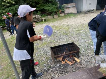 カレーを作るために火おこしをしています。