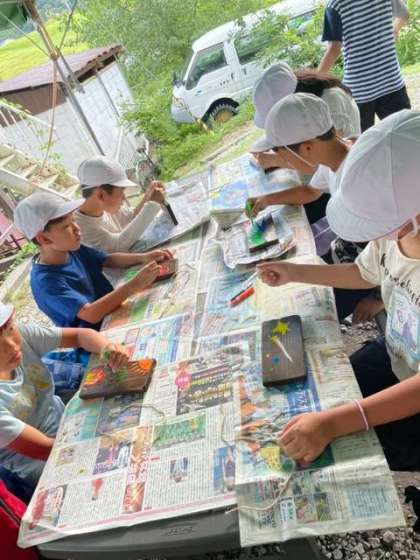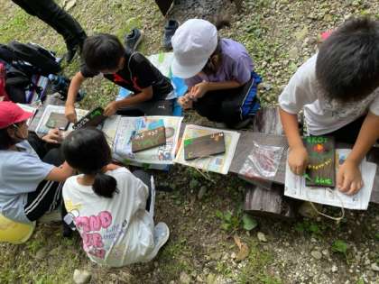 昨日磨いた板に林間の思い出をペンで描きました。明日持って帰りますのでお楽しみに♪