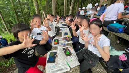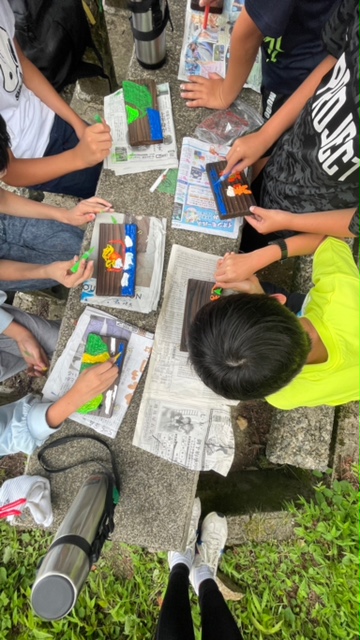 昨日磨いた焼き板に、今日は絵の具で色をつけて絵を描きました。班のみんなで見せ合いながらワイワイと作っていきました♪手が汚れてしまっても、楽しい思い出の一つになりました。
