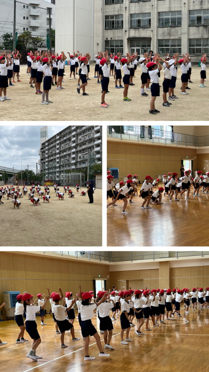 講堂と運動場で、リズムに合わせて体を動かし、子どもたちはよくがんばっていました。