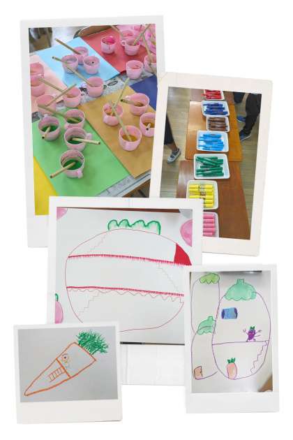 『シンデレラ』のかぼちゃの馬車や『ジャックと豆の木』の天までのびた豆の蔓のように、自分が選んだ野菜が大きく育った姿を想像し、絵に表します。